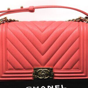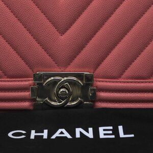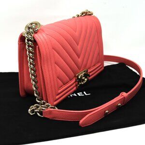 Chanel Medium pink Chevron caviar boy bag with gold tone hardware. Made in France. Comes with dust bag. 10"x6"