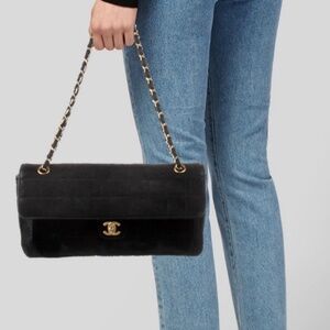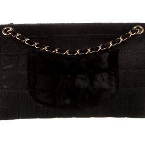 Rare black pony-hair bag. Please note that this is a larger bag than the classic mini! Originally purchased for $4500. I'm selling it because I recently purchased a new Chanel bag that is similar. This one is still in good condition, but there is a spot where the texture is a bit worn on the top of the bag (pictured). For that reason, I am selling it for much less than a typical Chanel bag of this size. Dimensions are 13" width, 7" length, 3" deep.