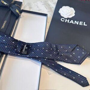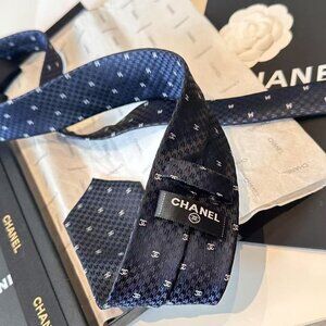 Elevate your style with this Chanel men's tie, featuring a striking black and red pattern. Perfect for any formal occasion.