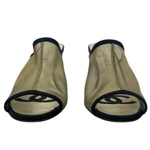 Chanel Mesh Goatskin Pearl Heel Mules Slip On Black Tan Size 37.5C