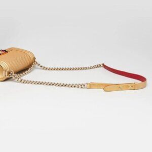 Karl Lagerfeld designed the Boy Collection as an interpretation of the boyish charm that Coco Chanel was known for. Karl was stated as saying that the very spirit of Chanel was inspired by Boy Capel, the love of her life; which is why this new collection is called the "Boy Chanel." This particular bag is from the Cruise 2014 is an updated version and features an embossed cube pattern and gorgeous enamel clasp. This particular bag features a long chain-link strap with a leather pad that can be used as a long strap or looped around as a shoulder bag. Current retail price for a small is $6400.