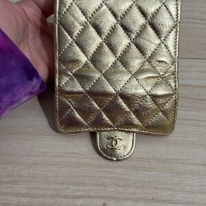 Chanel wallet in metallic gold. Features classic quilted design. Compact and stylish.