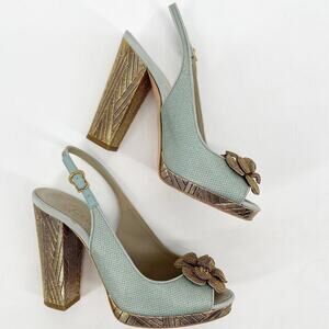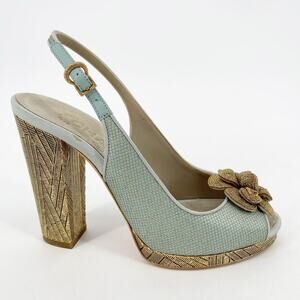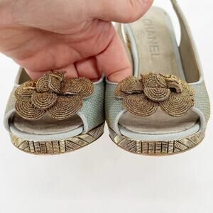 Chanel Metallic Gold/Teal Satin Camellia Flower Slingback Peep Toe Heel size 36C