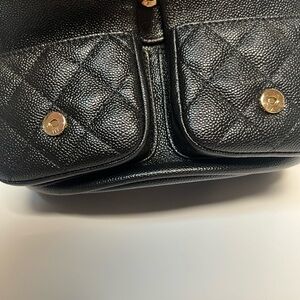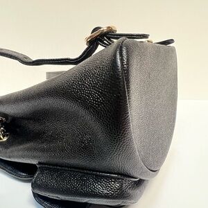 CHANEL shiny caviar quilted mini Duma. Black leather with light gold hardware. Unfortunately no box or dust bag as they were damaged during a move. Worn only a few times and stored in a box inside our closet since then!