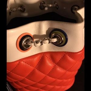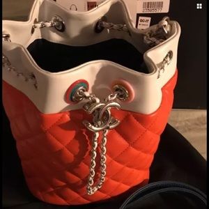 Authentic Chanel mini noe/bucket Crossbody bag. Only used a few times. From the Cuba Collection and sold out. Gorgeous colors! Soft Lambskin, clean inside and out. Comes with the card, duster and box. No trades! Not sure if I even want to sell this beauty. So only for the right price. Red, white and black leather with yellow, pink and green plexiglass