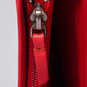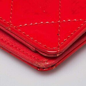 The exterior patent leather has some transfer marks on the rear, light rubbing to the corners, and creasing along the top. The interior has rubbing, stretching to the card slots and creasing throughout.
