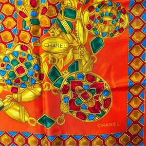 Elevate your style with this luxurious Chanel silk scarf. Featuring a vibrant orange base with elegant gold and green accents, this accessory adds a touch of sophistication to any outfit.