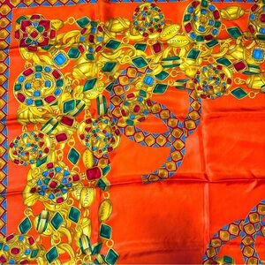 Chanel Orange Silk Scarf with Gold and Green Accents