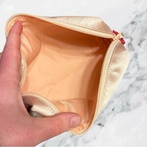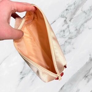 This Chanel Parfums cosmetic bag is a beige satin-style makeup pouch with red trim and a smooth zip closure, perfect for travel or everyday storage. It features the Chanel Parfums logo, a soft peach interior, and a roomy shape ideal for cosmetics, skincare, brushes, or small essentials. The bag is authentic, as shown by the Chanel Inc. interior tag, and it includes multiple angled photos of the exterior, sides, bottom, and lining. There are light marks and wear on the exterior from normal use, exactly as pictured, and the interior is clean with no major flaws. There are dents and some marks on the bottom. This is a great lightweight designer makeup bag for anyone who loves Chanel beauty, Chanel travel bags, Chanel toiletry pouches, or cosmetic organizers.