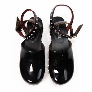 From the Pre-Fall 2015 Métiers d'Art Collection. Black patent leather Chanel clogs with faux pearl embellishments, interlocking CC at buckle strap closures and stacked heels. Includes dust bags.