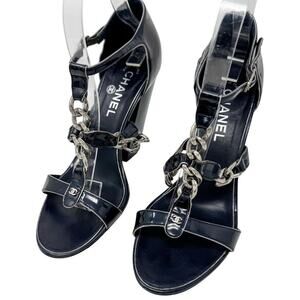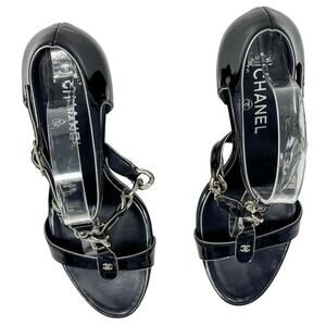 Chanel Patent & CC Logo Chain Link Navy Silver Block Heel Sandals size 39.5