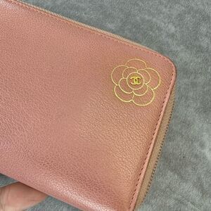 Excellent condition with authenticity card and Chanel booklet. Rare HTF piece in light pink leather with camelia flower. Full zip closure.