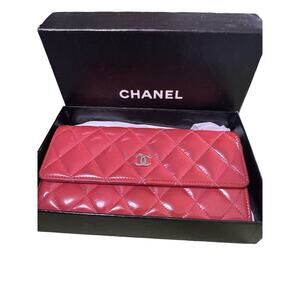 Gorgeous authentic Chanel Long Flap Wallet in pink patent leather featuring the brand’s signature diamond quilted design and silver-tone CC logo on the front. This elegant and timeless piece combines iconic Chanel craftsmanship with a vibrant, eye-catching color.