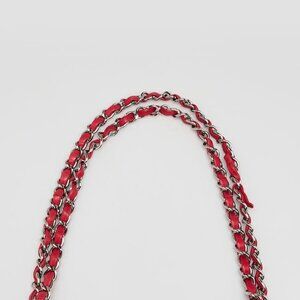 The exterior leather is clean but does show fading, light creasing, and some wear around the edges. The hardware is bright and shiny with hairline scratches. The interior has more of the same, with creasing throughout and scuffing. The chains have left impressions on the leather. Overall the bag remains in good condition with signs of light use.