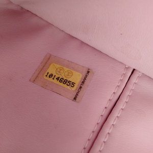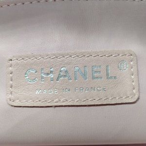 Chanel Pink X Black Terry Cloth Cc Logo Tote Bag Light pink/black/ivory canvas/leather 2006 CC logo tote bagPre-Loved, featuring signature interlocking CC logo, paint splatter detail, two top handles, open top, main compartment, internal zip-fastening pocket, internal patch pockets, internal logo patch, front zip-fastening pocket, silver-tone hardware and circa 2006. 100% AUTHENTIC Width (inch) : 18.8" Height (inch) : 12.2" Depth (inch) : 7.48" Date Code, Number: 10146855 The serial code indicates a production date of: 2005-2006.