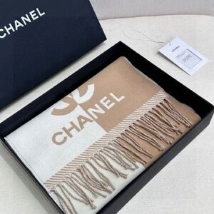 Elegant CHANEL scarf with iconic logo pattern. Soft gray and cream tones. Perfect for any occasion.