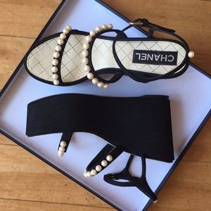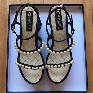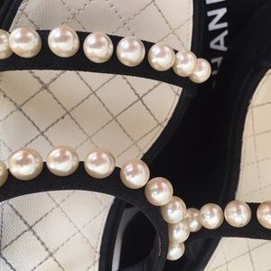 Lovely high platform shoes from Chanel with classic pearls decoration. A good choice for styling and photoshoot. Only wear once. Items are in good condition with original shoe box and dust bags.