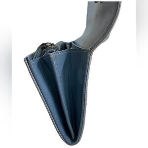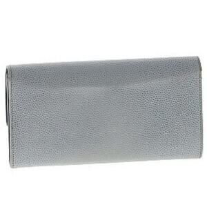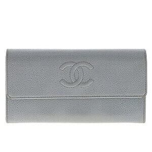 This wallet is crafted of beautiful caviar leather, with an embroidered interlocking CC logo on front flap. The wallet features a snap closure. Blue textile and leather interior in a rich darker blue leather. Features card slots, bill compartments, and a central zipper compartment with leather pull tab.
