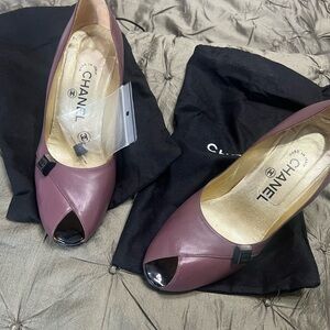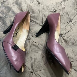 These Chanel pumps are women's size 38.5 in Bordeaux lambskin leather with an open-toe design. They feature the Chanel logo accents and a solid purple color. The heels are stylish for parties or cocktails, designed in Italy with a leather upper, lining, and insole. The outsole is also made of leather, providing a luxurious and high-quality finish. Come with box ,dust bags and hill protectors which fit over the stiletto when replace is needed.