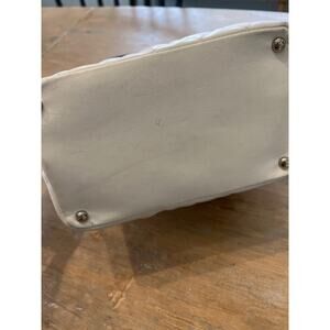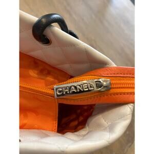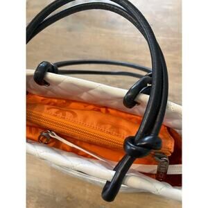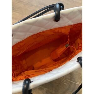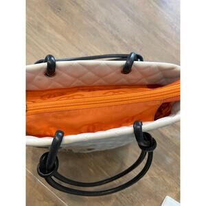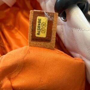 Details: White Cream Leather, double zipper compartments on inside as well as zipper top closure, orange logo lining