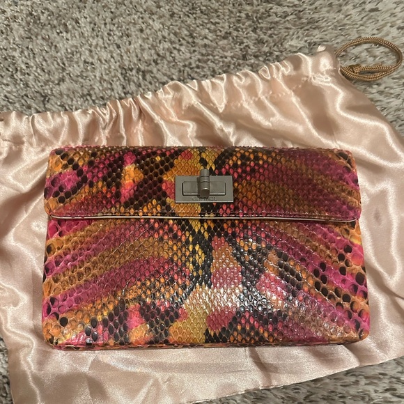 Beautiful clutch - only issue is a small stain in the interior pocket - very minor but I didn’t want to list as excellent bc of it. It’s really beautiful. Sorry for the shadow in my pics I just saw as I was uploading