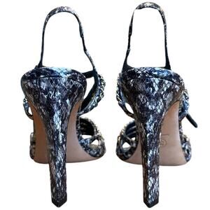 These are truly striking and so sexy on the foot, worn once in near new condition perfect besides very light wear on outsole, these are a varied indigo blue/purple and white snakeskin with light shimmer that catches the light beautifully. Strappy woven beautiful silver chain detailing, featuring a triangle front cut out on your foot - stunning! CC logo charm dangles at front of foot. Leather interior. Pics do these no justice, they are perfect for any formal or glam occasion!