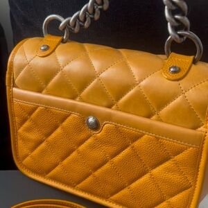 Chanel shoulder bag in vibrant orange leather. Features quilted design and silver-tone chain strap. Iconic CC logo on the front.