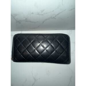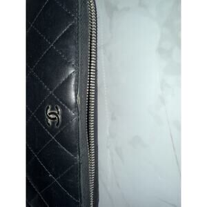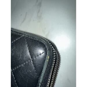 This Chanel quilted wallet is a sophisticated accessory, crafted from luxurious black leather. It shows some wear on the piping and the interior zipper is missing, but it remains a stylish and functional piece. Comes with a dustbag, authenticity card, and receipt. Perfect for Chanel enthusiasts looking for a classic addition to their collection.