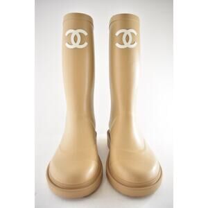 Chanel REV Beige White Wellington Wellies CC Logo Pull On Rubber Rain Boots 40