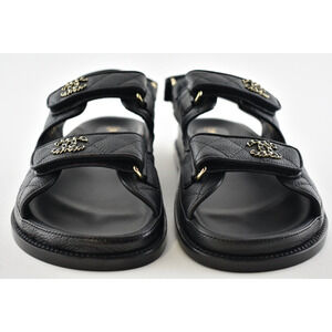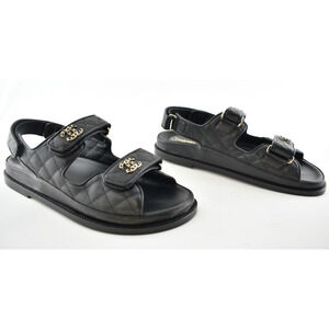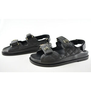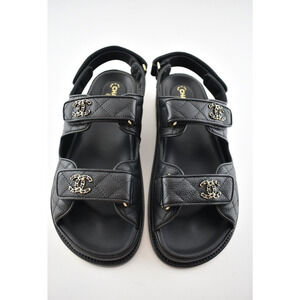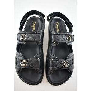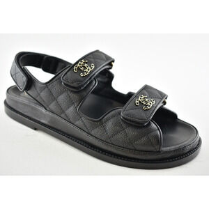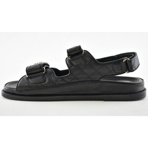 Chanel REV Black Caviar Gold CC Logo Mule Slide Strap Flat Teva Dad Sandal 36.5