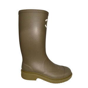 Chanel REV Dark Beige Moss Green White CC Logo High Pull On Rubber Rain Boots 42