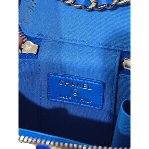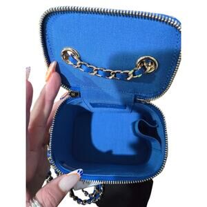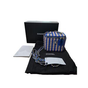 Chanel Raffia Mini Vanity Case Jute Blue & Beige w/ Crossbody Strap, Card & Box.