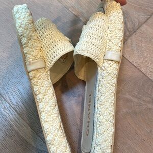 Great pre- owned condition! Wear on soles. A few lightened spots on raffia but barely visible to naked eye. See photos for reference and wear details. Purchased on posh as authentic Chanel. Size 39/US 8/8.5