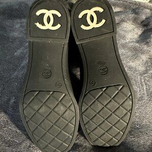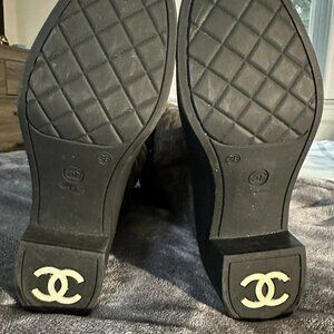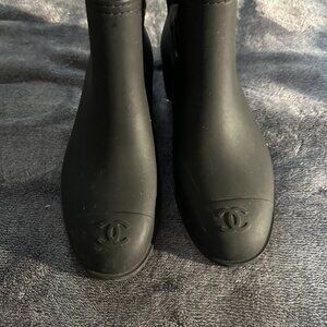 Vintage Chanel Rain boots black rubber bottoms and gray Suede shaft with insulated shearling. Good condition.