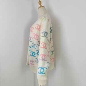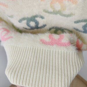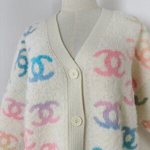 The cardigan is embellished with a rainbow-colored gradient jacquard featuring the Double C logo. The vibrant, layered colors, ranging from soft pink and light blue to lavender and pale yellow, showcase the brand's signature while injecting a lively, sweet, and youthful vibe.