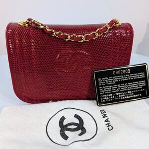 This is a stunning vintage Chanel flap bag crafted from luxurious red lizard skin. It is a Series 0 (1986-88), one of the first models produced after Karl Lagerfield joined Chanel and instituted the serial number system for the bags. As with all vintage bags produced before late 2008, all hardware on this bag is plated in 24k gold. The exterior displays a red scale-textured pattern across the body of the bag and the flap. The exterior is in stunning preowned condition, with minimal wear to the corners or edges. The front flap features an embossed interlocking CC logo, and opens with a magnetic snap closure to a pristine red leather interior. The bag is carried by a long, 24k gold plated single chain strap that is interwoven with red leather, characteristic of Chanel's iconic style. The chain strap enable crossbody use and, with some wrapping of the chain, shoulder or handle carry.