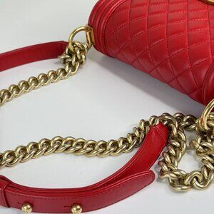 Chanel Red Leather Small Boy Bag Full Set with Gold Chain Strap