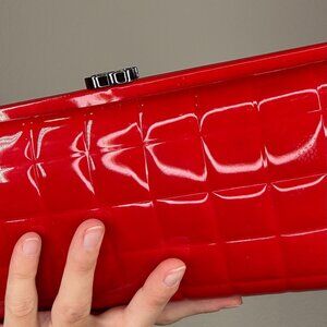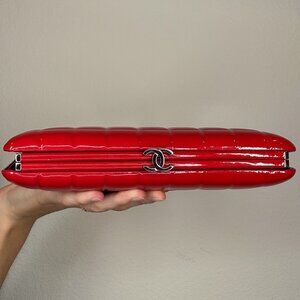 Chanel red patent hard shell clutch. Chocolate barre quilting style. Ruthenium hardware.