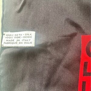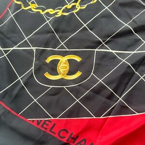 Elegant 100% Silk Chanel scarf featuring a their classic bag and chain in black, red and gold. Perfect for adding a touch of luxury to any outfit. Plus scarves are all the rage now. This is a unisex piece.