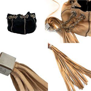 The bag features silver chain link leather threaded cinch straps top handles with a silver Chanel CC cubed leather tassel at the end
