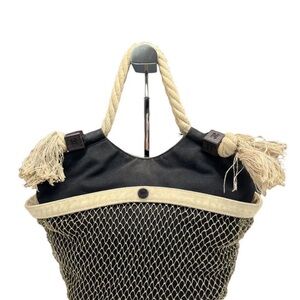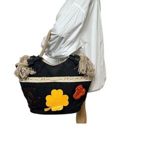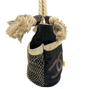 This is a vintage authentic Chanel 2003 CC Camellia Rope Tote bag made of black canvas with beige suede trim and rope handles. PRELOVED.