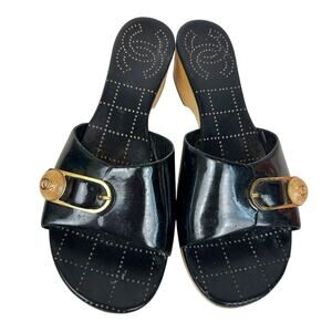 Chanel SS 01 Black Patent Leather CC Safety Pin Logo Wooden Clog Sandals 7