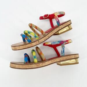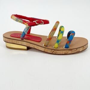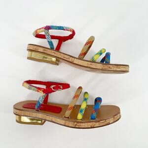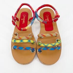From Chanel’s Spring/Summer 2017 Collection under Karl Lagerfeld, these colorful sandals feature multicolor woven rope straps and adjustable ankle closure. The natural cork midsole is accented by a gold metallic heel detail with the iconic CC logo. A playful, statement design that perfectly embodies Chanel’s modern resort aesthetic. Made in Italy.