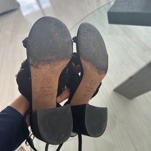 Stunning Chanel Sandals, suede twisted/knotted with chain sandals. Limited Edition gold chain and black suede. 38.5 but fits a 6 US. Worn but in great condition with dust bag and box. Slight scuff in the front toe area, soles are worn.