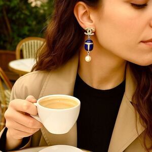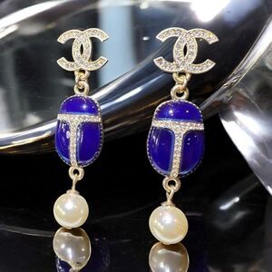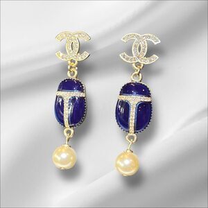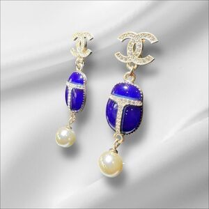 Elegant Chanel Scarab gold and blue drop earrings featuring rhinestones and enamel . Perfect for adding a luxurious flair to any outfit.