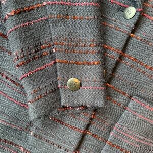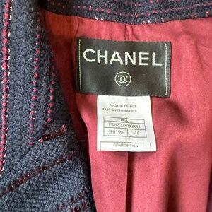 Stunning authentic Chanel jacket form the fall 2000 collection. Made in France. This piece features classic Chanel craftsmanship with a modern twist - navy textured tweed woven with a shimmering red-copper sequins that catch the light beautifully, Fully lined in a rich burgundy silk. In excellent pre-loved condition - sequins in tact and fabric in beautiful shape - the only flaw I see is the buttons on the sleeves are slight chipped - see photo.