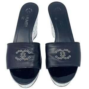 AUTHENTIC Chanel CC Logo Black Leather White Gold Silver Metallic Grommet Wavy Platform wedge block heels womens shoes sandals