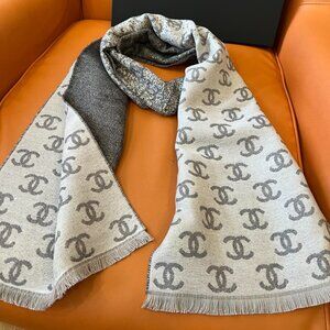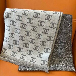 Add a touch of signature luxury with this Chanel fringe neckwear. The reversible camel and off-white design, showcasing the iconic CC logo and elegant fringe, offers a sophisticated and versatile accessory.