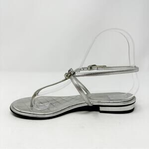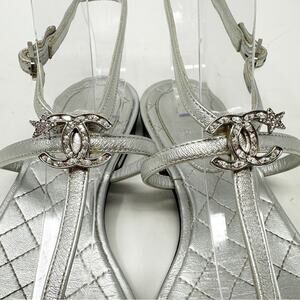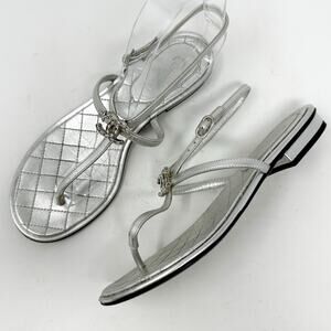 Chanel Silver Leather Crystal Embellished CC Thong Flat Sandals