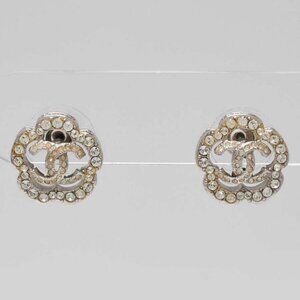 Chanel Silver Metal Crystal Camellia Flower Stud Earrings